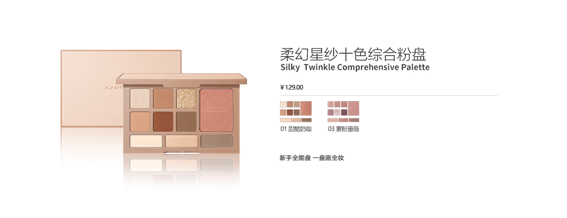 粉质细腻帖服,一抹显色,不易飞粉;配色百搭日常,质地多元,满足不同妆容需求。