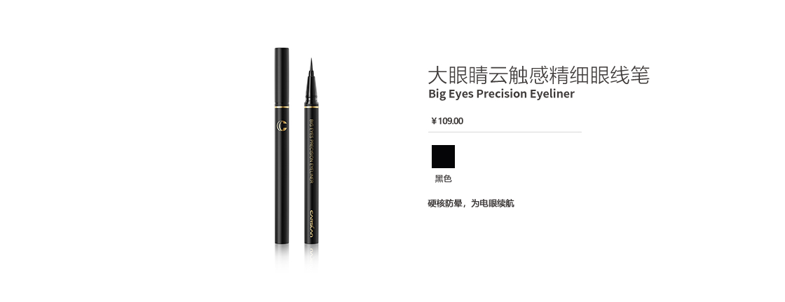 炭黑原料配方[1],饱和度高附着力强,上眼更显色更亮泽。复配聚合成膜剂[2],上眼后表面形成隔离膜,一笔速干。