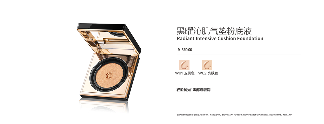 奢润*:指对肌肤的保湿作用,第三方实验结果,通过30名以上20-45岁亚洲女性单次使用卡姿兰黑曜沁肌气垫粉底液后,对肌肤有保湿效果,效果因人而异