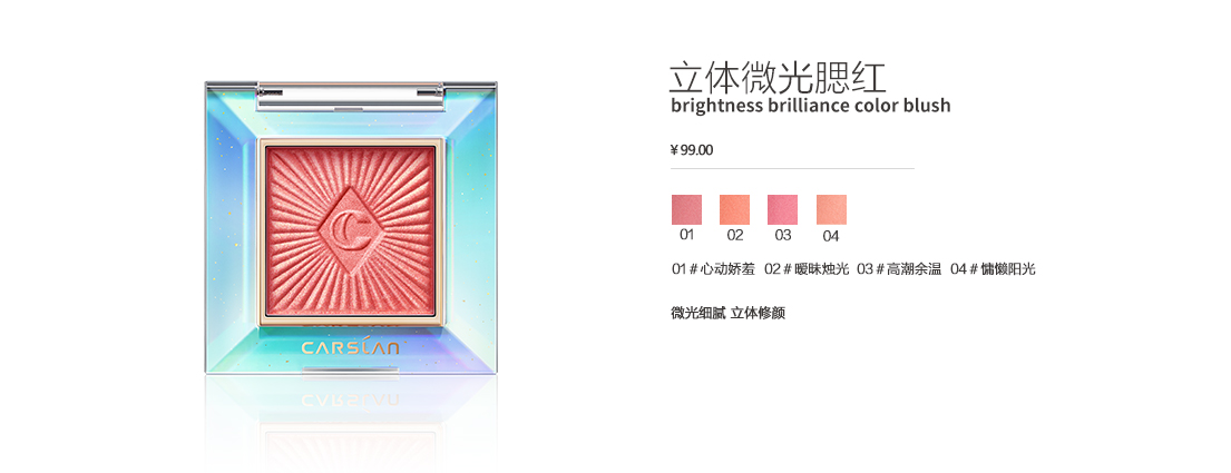 细腻微珠光颗粒均匀分布在粉体中,带来柔和立体感妆容。轻轻一抹可做颊彩,局部叠涂可加强光泽感。