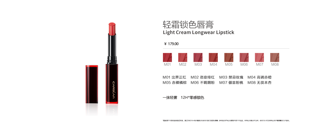 一抹诠释鲜明色彩,倾慕之间尽显出色质感;同时拥有锁妆能力,帮助妆容不易脱色。